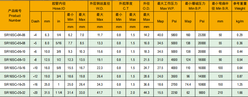 應用:較小彎曲半徑的高壓液壓油基和水基液壓系統。優異的脈沖和超過 SAE100R2 和 SAE100R16 標準要求的彎曲性能。膠管擁有更加緊湊的尺寸和較小的彎曲半徑 2SN 膠管在機械裝配上有更好的性能。