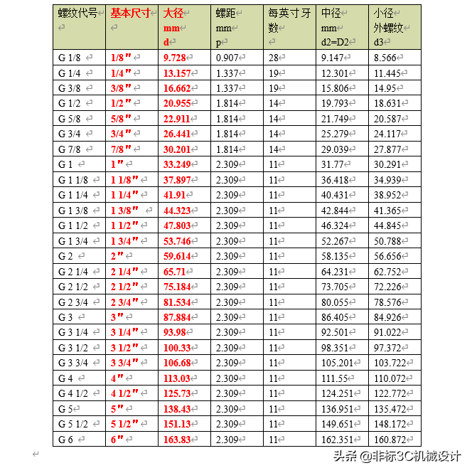 對于G開頭的,或者說是對于英制螺紋來說,同樣用卡尺量下螺紋的最外面的尺寸,但這個只是大徑尺寸(mm),在下表中找多對應的代號: